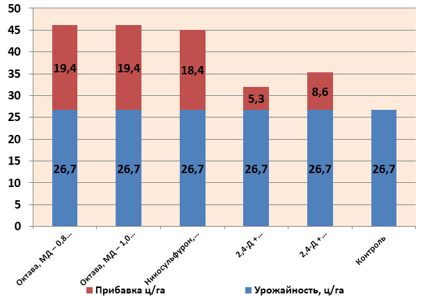 Испытания препарата в Краснодарском крае в посевах кукурузы, проведенные сотрудниками ВИЗР в 2013 году, показали 100-процентную эффективность Октава, МД против бодяка щетинистого, мари белой, щирицы запрокинутой, куриного просо. И это всего через 45 суток после обработки! При этом урожайность кукурузы по сравнению с контролем увеличилась на 19,4 ц/га и составила 46,1 ц/га.