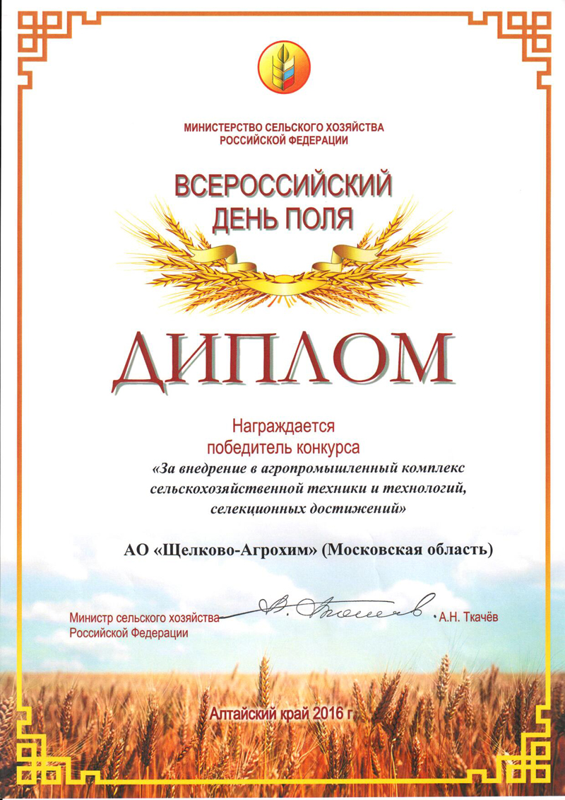 19.07.2016: 14-16 июля 2016 года в Алтайском крае прошел Всероссийский день поля под эгидой Министерства сельского хозяйства России и Министерства промышленности и торговли страны. «Щелково Агрохим» приняло активное участие в проведении Всероссийского дня поля, организовав круглый стол, демонстрационные показы посевов с применением современных схем защиты культур и сельхозтехники.