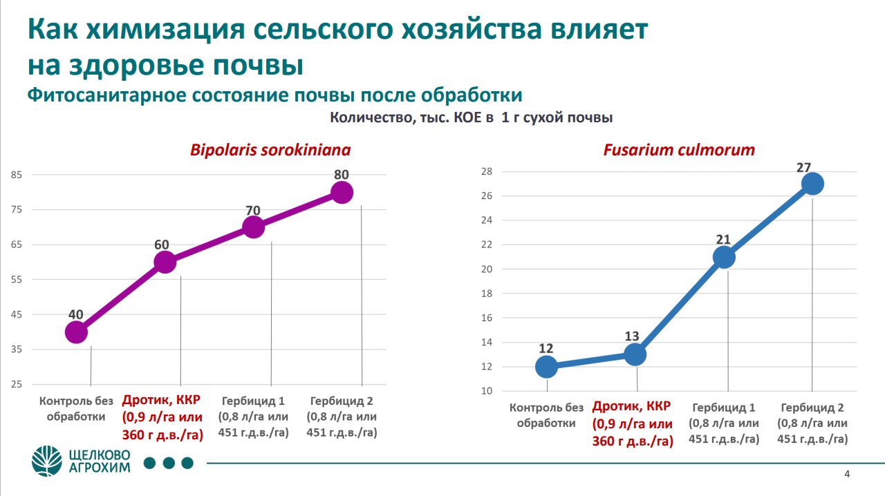 По данным за 2025 год в РФ внесено около 277,5 тыс. т средств защиты растений. Это примерно 3 кг/га. Это немного, но споры о вреде химикатов не утихают. Между тем, есть данные исследований, которые показывают, что «химия» не всегда вредит почве. К примеру, после применения гербицида ДРОТИК, ККР содержание микроорганизмов, вызывающих гельминтоспориозные и фузариозные гнили, снижается по сравнению с результатами после применения конкурентных гербицидов (см. рис. 1). Благодаря сниженной концентрации д. в.: 360 г/л против 451 г/л.
