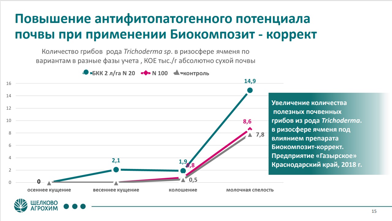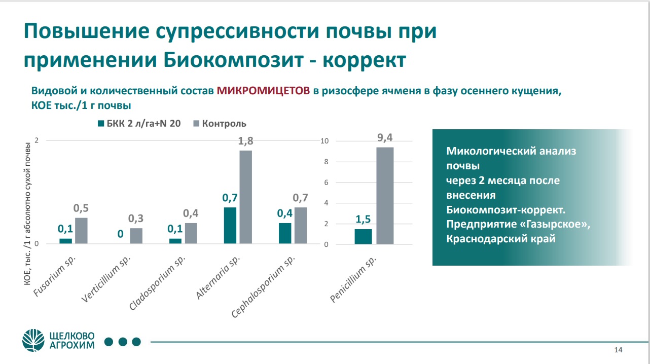 В группе биопрепаратов, которые применяются сегодня в сельском хозяйстве, Салис Каракотов выделяет основные: биопестициды, биоудобрения, препараты для повышения супрессивности почвы и инокулянты. В ассортименте «Щёлково Агрохим» это БИОКОМПОЗИТ-ПРО, Ж, СТАККАТО, Ж* (фунгициды), АЗАФОК (удобрение), БИОКОМПОЗИТ-ДЕСТРУКТ, БИОКОМПОЗИТ-КОРРЕКТ (повышают супрессивность почвы) и РИЗОФОРМ ГОРОХ, РИЗОФОРМ СОЯ (инокулянты).
