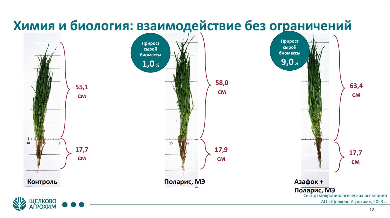 «Наилучшего эффекта в экспериментах мы добились при совместном использовании химического протравителя и микроудобрения АЗАФОК. Мы получили максимальный прирост биомассы именно в этом случае», - подчеркнул спикер. (См. рис. 2)